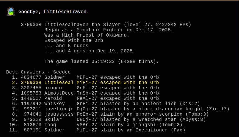 Anyone have any advice on what I could have done better? https://cbro.berotato.org/morgue/Littlesealraven/morgue-Littlesealraven-20251219-120738.txt