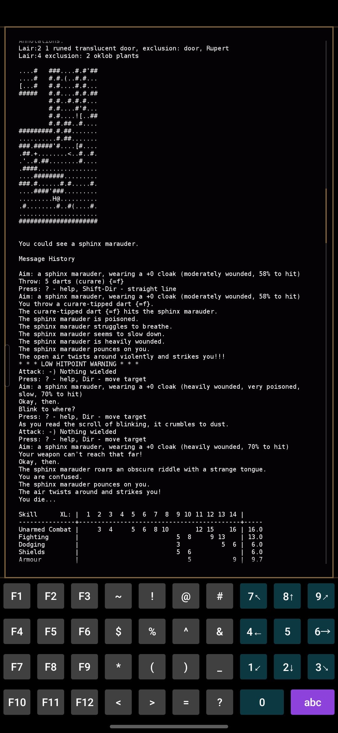 I got down to d13 after clearing orc and lair where i discovered that sphinx marauder are actually Rupert’s long lost twin seperated since birth and not an idiot hexer with no melee attack capable of punching through my shinny, oiled up abs covered by 29.6 AC.