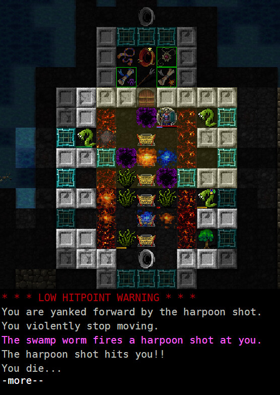 It’s a dangerous vault! You’re not fighting 1 swamp worm, but 6! And they pull you into brambles that harm you (the swamp worm attack describes that this is possible)! And they yank you around so positioning is very difficult! And they clouds hurt you too! And then there’s the net traps!