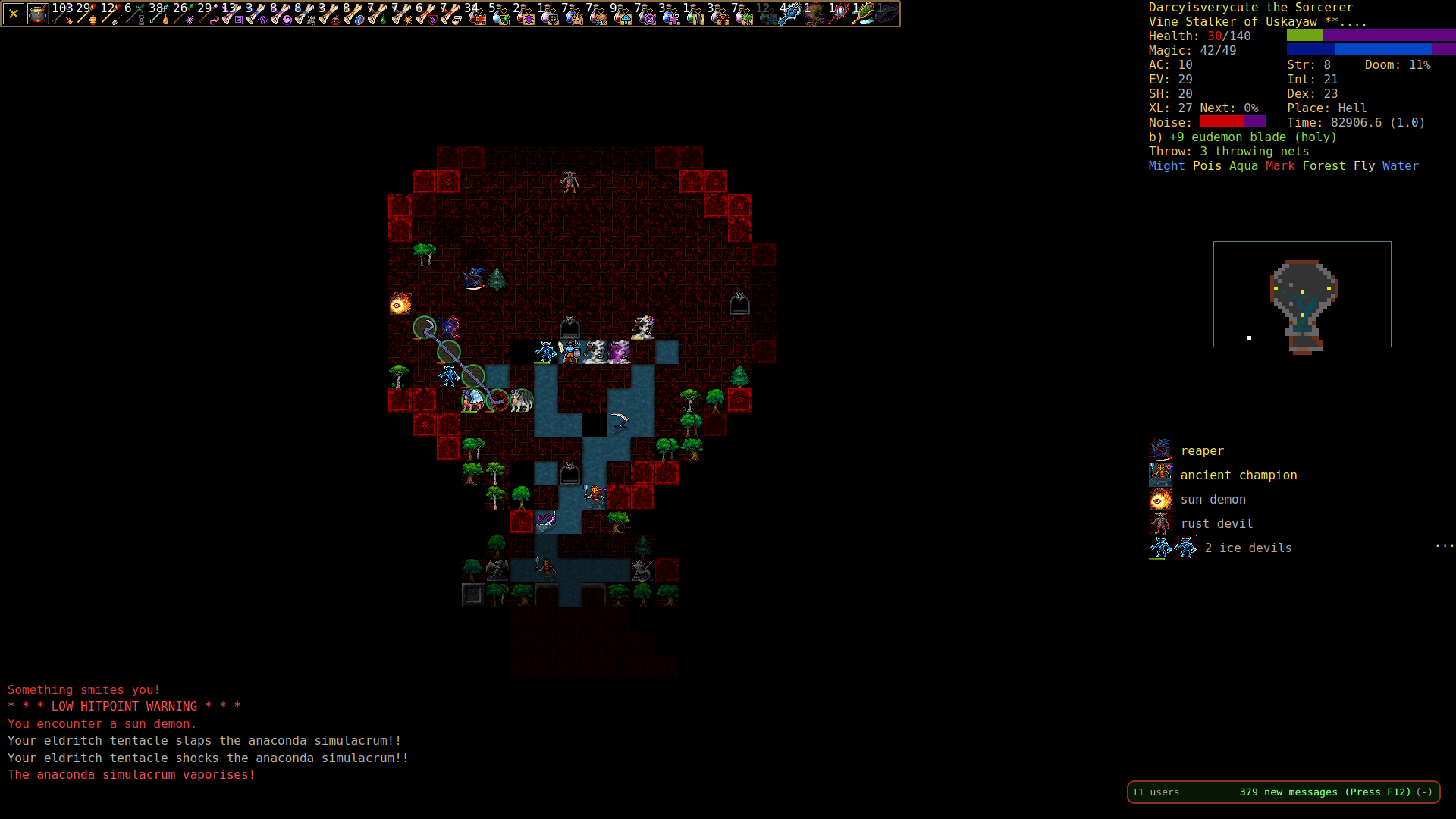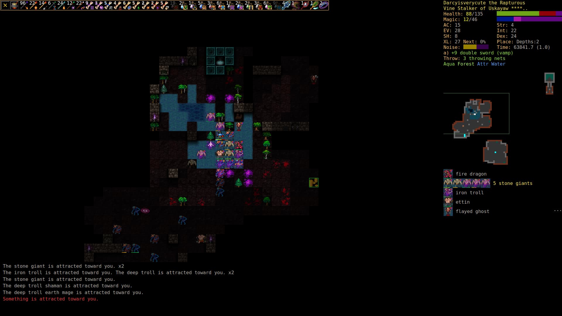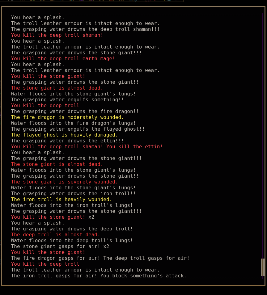 But in the meantime, I decided that Tangela is pretty cute, and I hadn’t tried a dexterity build before, so elected to play a vine stalker enchanter. Big credit to Oneirical for sticking around with me through it in spectate and having lots of fun conversations about the gameplay planning. It was only upon being told that confusing touch is a staple spell that I actually learned it (oops!) after clearing a few floors. And I can see why - I used it and it made an orc warrior burst out in tears crying in front of me! I was near some water… and a lot of them drowned. Then there were two huts filled with a dozen trolls at a bridge on a lake, and I drowned almost every single one. I realised this character is starting to become a little inhumane.