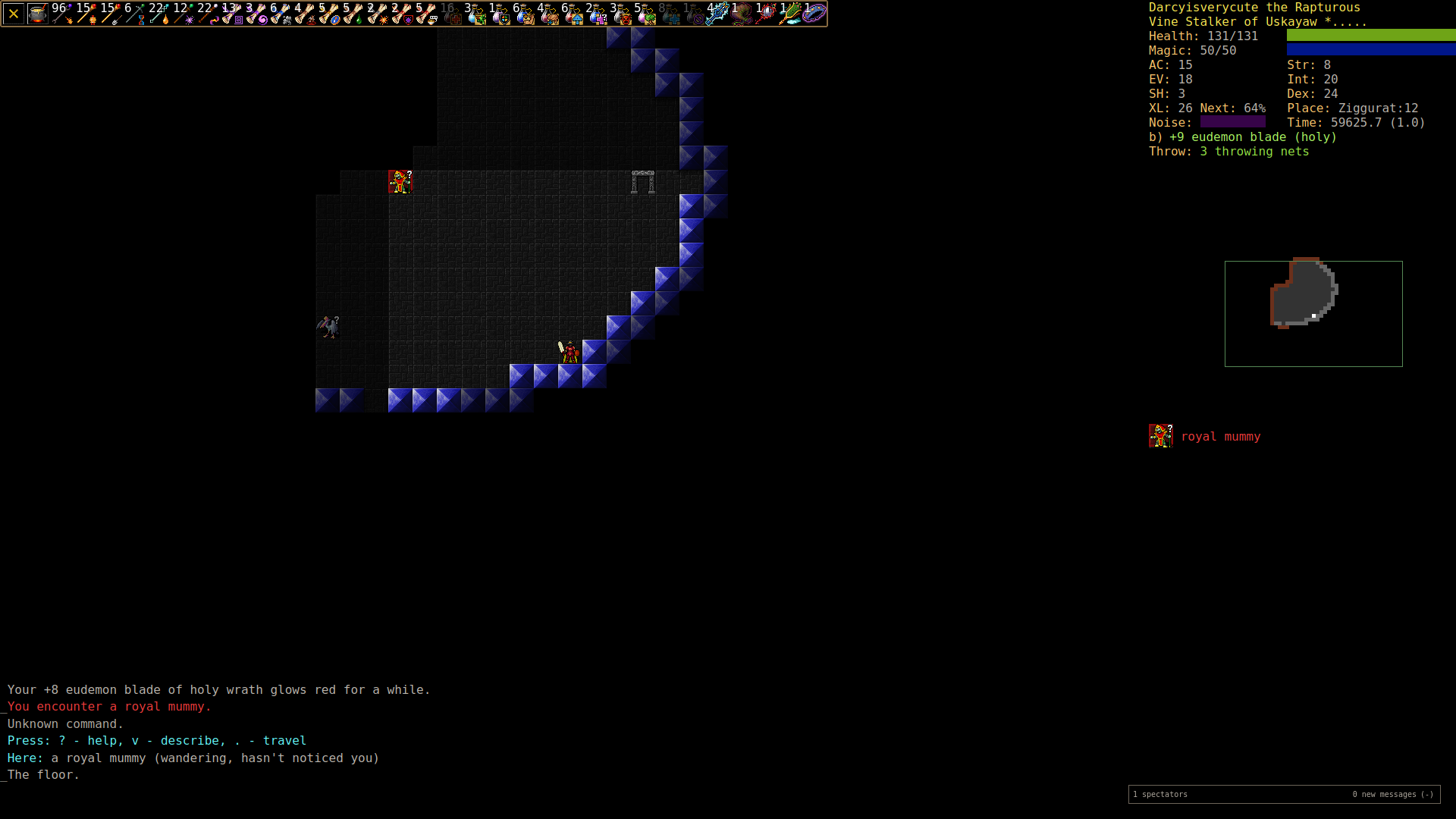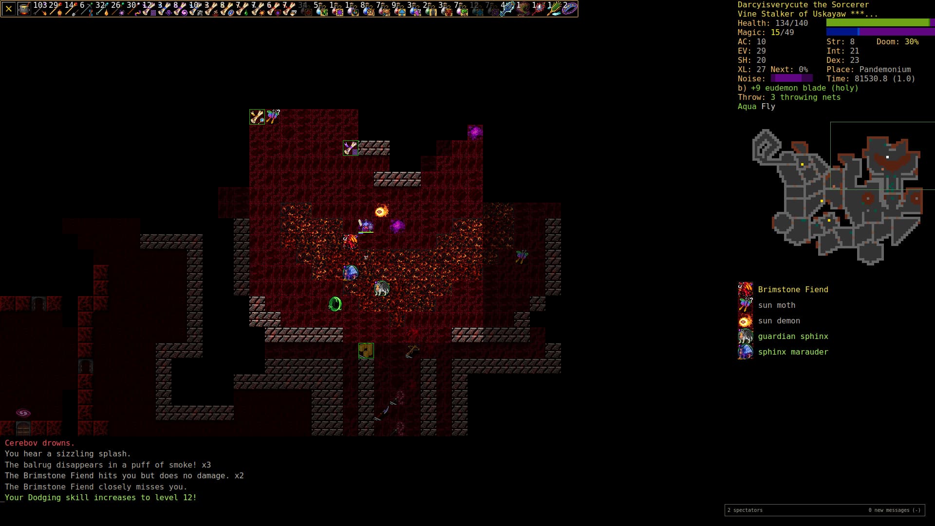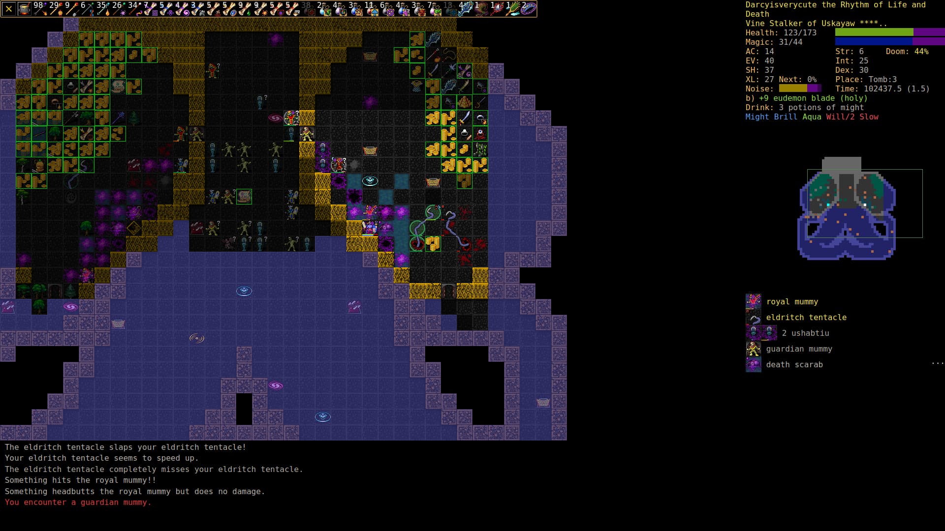 But in the meantime, I decided that Tangela is pretty cute, and I hadn’t tried a dexterity build before, so elected to play a vine stalker enchanter. Big credit to Oneirical for sticking around with me through it in spectate and having lots of fun conversations about the gameplay planning. It was only upon being told that confusing touch is a staple spell that I actually learned it (oops!) after clearing a few floors. And I can see why - I used it and it made an orc warrior burst out in tears crying in front of me! I was near some water… and a lot of them drowned. Then there were two huts filled with a dozen trolls at a bridge on a lake, and I drowned almost every single one. I realised this character is starting to become a little inhumane.