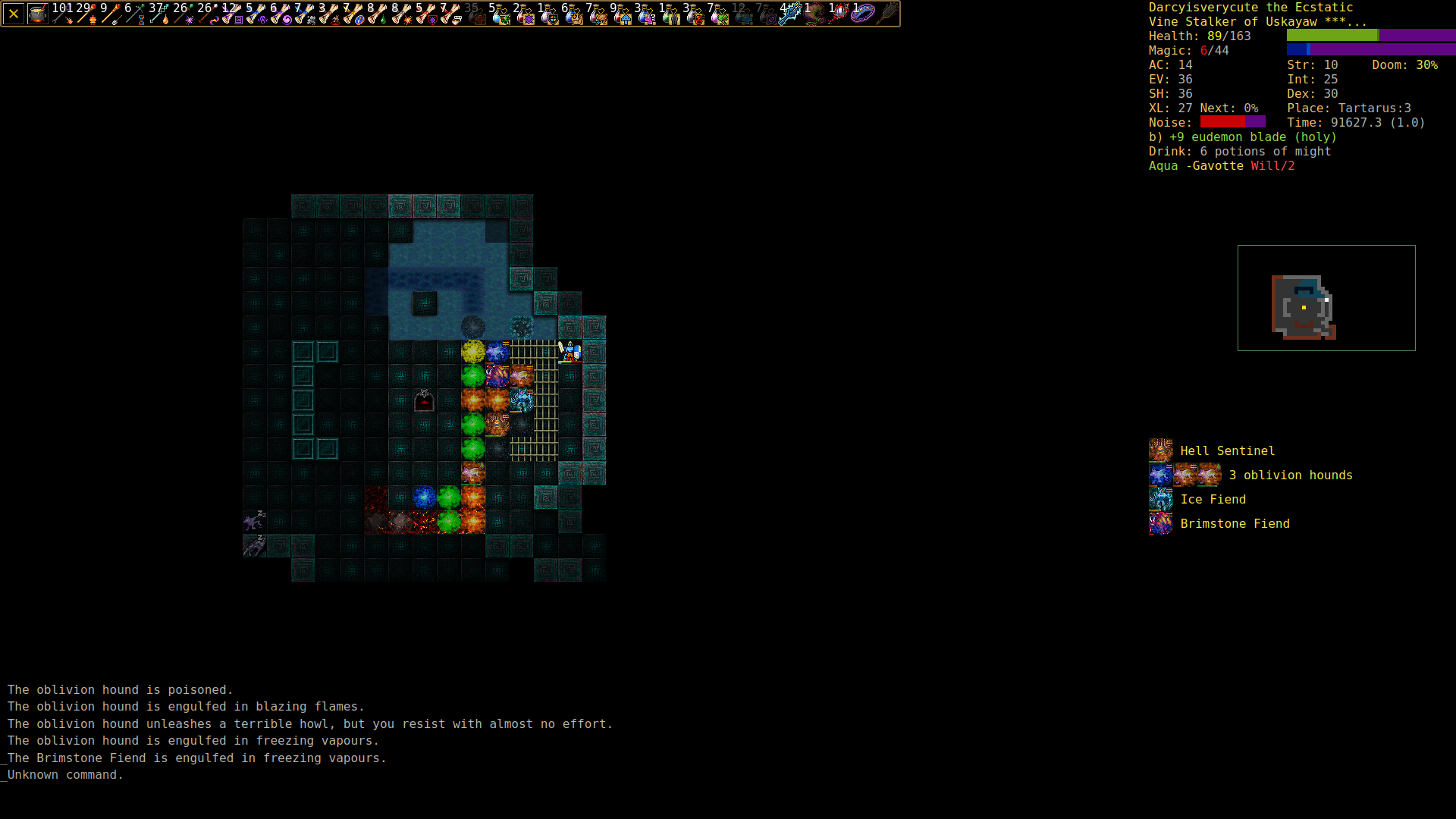 The first real use of Uskayaw was upon finding a recalled Mennas, Asterion, Boris and Balrug, among others, trying to ambush me. Immolation and Uskayaw made short work of them. Uskayaw was starting to feel rather inhumane with all that paralysis, but little did I know how much worse it would get.