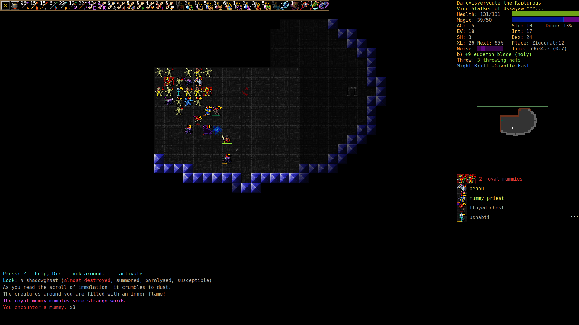 The other stairs down were also nasty looking ambushes which I did not clear and decided to go to Ziggurat to get enough levels to put on my wellspring talisman of Vavvilin {rPois rC+++ Will- Str-4} since my build was feeling very squishy with only melee attacks. The plan was to later get summoning points for Sphinx sisters, but I had to decide to do only one at first. I’d only visited the Ziggurat once before up to level 5, and, yep, I went up to level 12 this time! And let me tell you! Floor 6 was mummy royals! Haste, brilliance, might, immolation and manifold assault pulled me through with a surprisingly high health total.