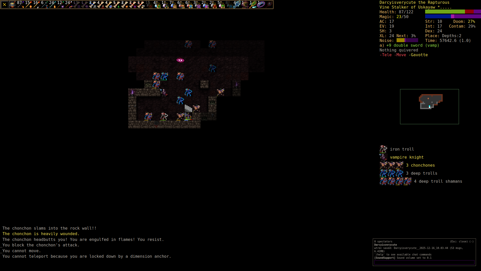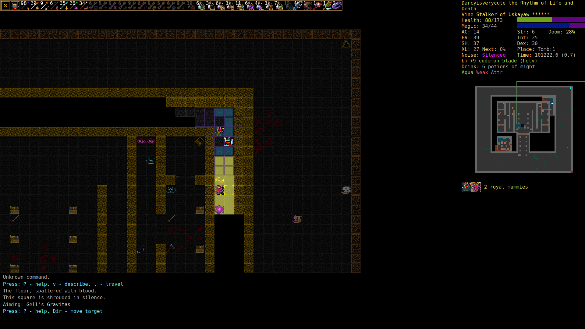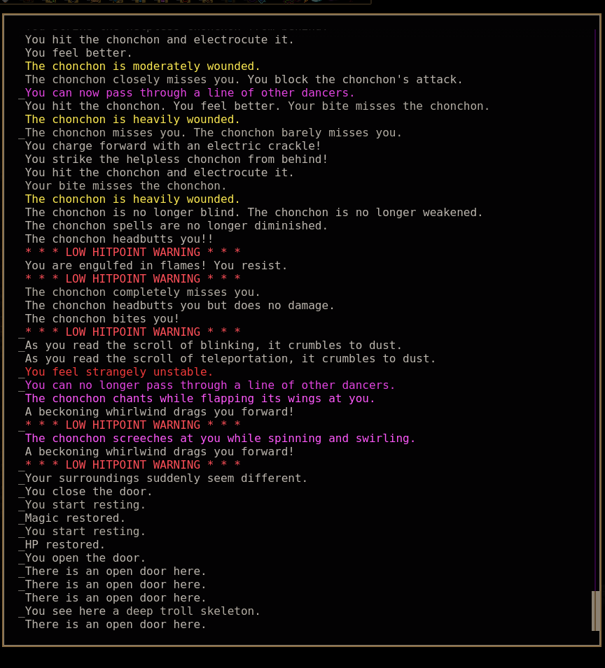 I’d cleared all of the firsst four floors of Vaults by then and decied to go to Depths. It was brutal! My first stairs had me ambushed by chonchones that immediately ripped me off, plus a miscast that locked movement. I did manage to get out, though.