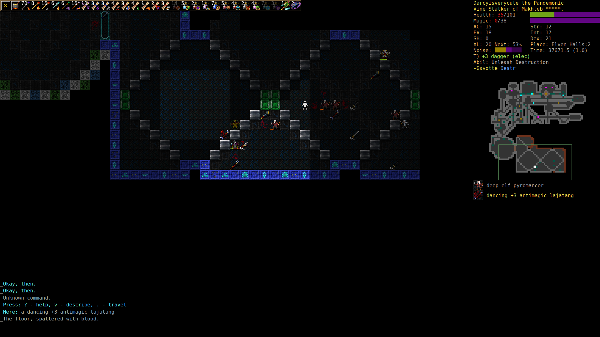 The plan was mostly going well, except there was one very dicey encounter in Elves that took a lot of contemplation to get out alive. An antimagic lajatang ambushed me and before I knew it I had no mana and almost no health, there were invisible enemies everywhere and I could not see invisible, and I had to use everything at my arsenal to escape.