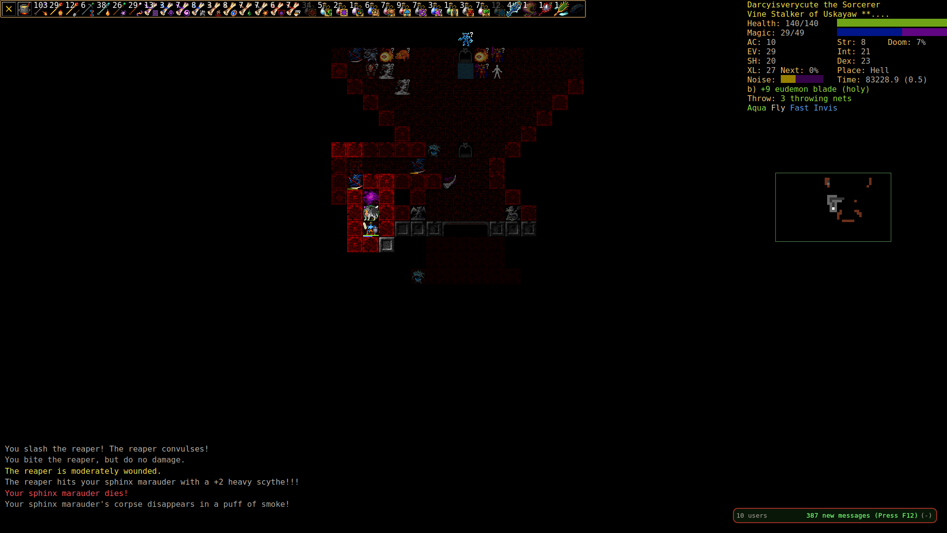 Then, my arch nemesis, Lom Lobon. They killed me on a previous run as a gargoyle earth elementalist! I am out for blood, and it was inhumane. In Pandemonium I made liberal use of Usk’s grand finale to knock out most of the bosses.