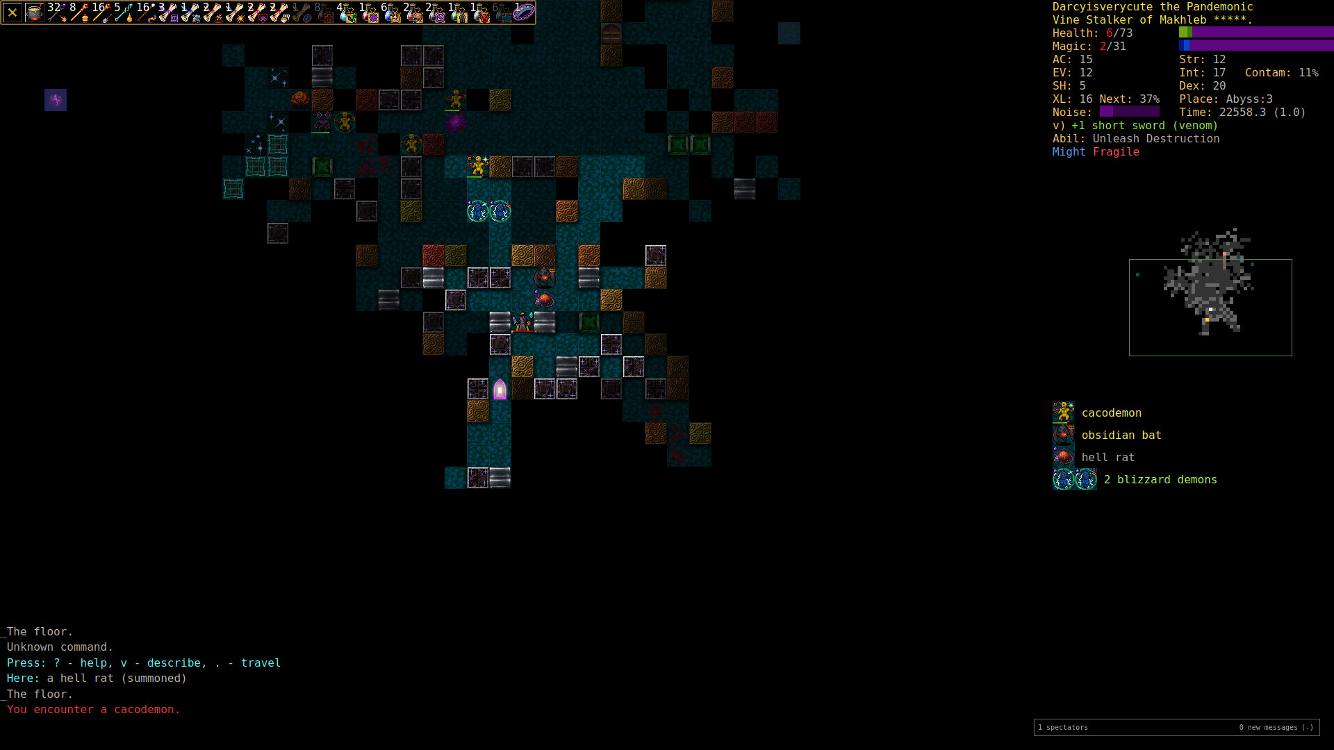 Initially I was going to switch to Lugonu, so I used a distortion weapon to go to the Abyss, immediately found the rune there, and made my way towards it. But then - surprise! - makhleb summons turned on me and I only barely got out with a well placed tambourine, leaving the rune behind.