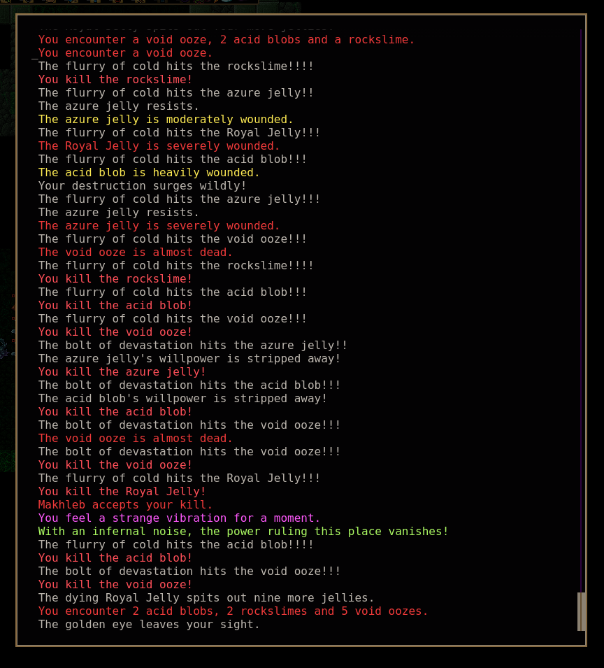 Queen slime got absolutely destroyed by my inhumane orbs, perhaps as Makhleb’s last ditch effort to beg me to stay, but I had already decided against it.